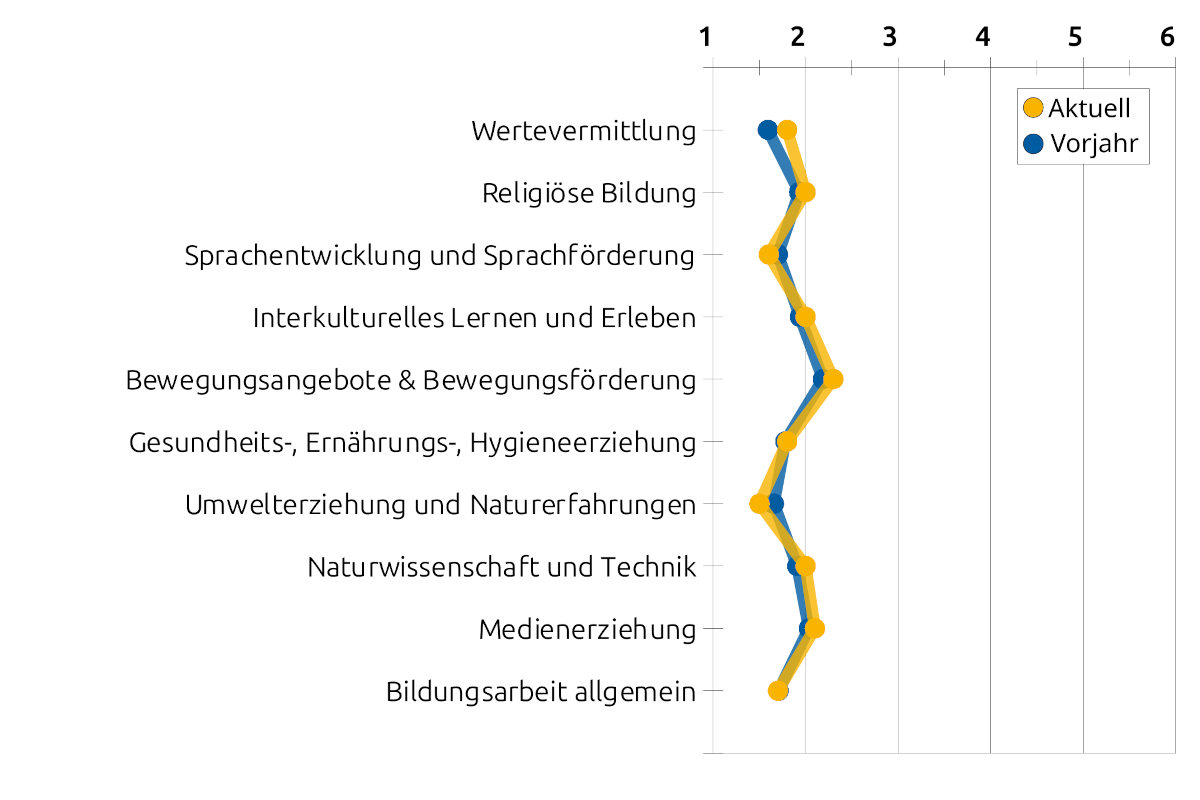 Im Durchschnitt vergaben die MOMO-Eltern für die Bildungs- und Förderangebote die Schulnoten 1,5 (Musik, Kunst und Kultur, Umwelterziehung und Naturerfahrung) bis 2,3 (Bewegungsangebote und Bewegungsförderung). Im nächsten Kita-Jahr möchten wir uns deshalb besonders auf das Thema Bewegung konzentrieren. Bewegung gehört zu unserem pädagogischen Alltag bereits fest dazu - im Innen- wie im Außenbereich. Um es noch sichtbarer zu machen, ist geplant, gemeinsam mit den Kindern eine Wand zu gestalten. Darauf soll veranschaulicht werden, wie z.B. regelmäßige Bewegung im Tagesablauf, freie Bewegung im Garten und Projekte wie Waldtage und Schwimmkurse umgesetzt werden.